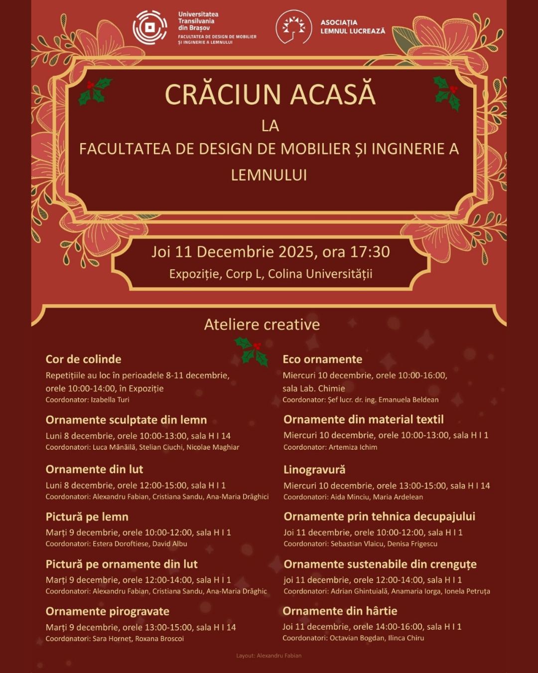 Vă invităm în perioada 8-11 decembrie, în corpul H, la activitățile organizate de Facultatea de Design de mobilier și Inginerie a Lemnului, cu ocazia Crăciunului! În cadrul evenimentului „Crăciun acasă” vom organiza numeroase ateliere în cadrul cărora cei prezenți vor învăța să confecționeze ornamente de crăciun, prin diferite tehnici și cu diverse materiale. Participanții vor fi îndrumați de studenți din anii mai mari ai Facultății de Design de mobilier și Inginerie a Lemnului.